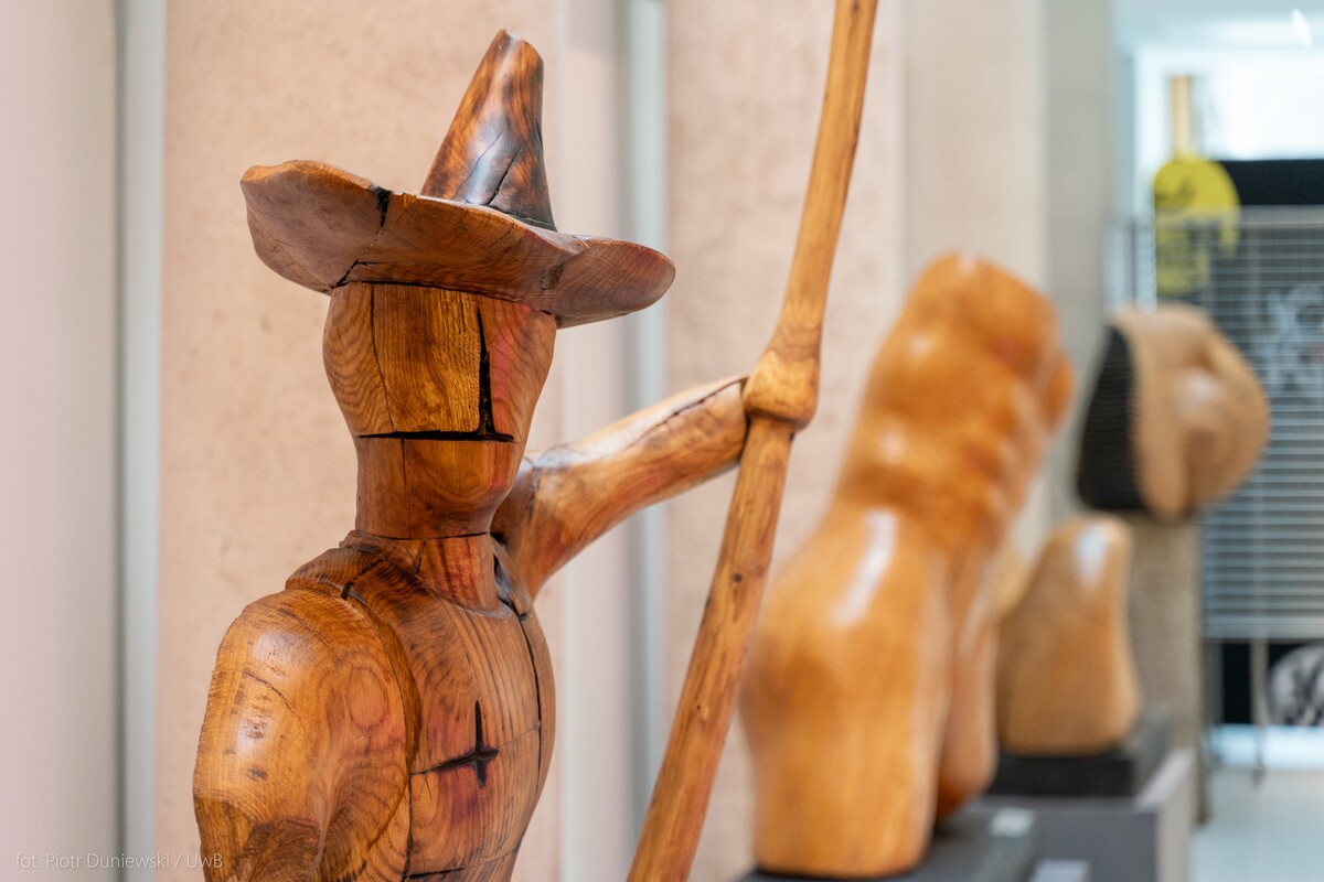 - Po raz kolejny Uniwersytet w Białymstoku staje się miejscem spotkania nauki z kulturą, sztuką i literaturą. Tematem przewodnim wystawy jest postać ludzka - inspirowana bohaterami arcydzieł literackich, teatru, mitologii - która odwołuje się do uniwersalnych tematów i ponadczasowych narracji. Tematyka rzeźb oraz sposób ich przedstawienia zachęcają do refleksji nad obecnością piękna w naszym życiu. Postacie literackie wydobyte przez artystę w drewnie stają dzisiaj na uniwersytecie w rzędzie, byśmy mogli przypomnieć i zbliżyć się do źródeł naszej wyobraźni, wrażliwości oraz odnaleźć równowagę między rozumem i sercem – mówi dr hab. Krzysztof Korotkich, prof. UwB – literaturoznawca i prorektor UwB ds. kształcenia.